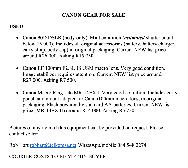 3. Send your text and images (if you want to show images of your equipment to potential buyers) to include a description of what is for sale, the price and all your contact detail included in the text, all in one document, e.g. a Word or Pdf document, and it will be published. If you send text separate from images, unfortunately only the text will be published.