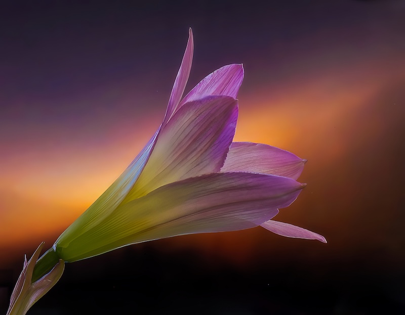 Instead of photographing the lily separately, cutting it out and superimposing it on another photo for the background, I photographed it with a single image. For this purpose, I used an image of my own on a monitor for the background, with the lily some distance away but in front of the monitor. In this way, the image on the monitor will be out of focus. This allows one to separately adjust the position and the intensity of the two images independently. The lighting for the object in front of the monitor, of course, has to be shrouded from the monitor.