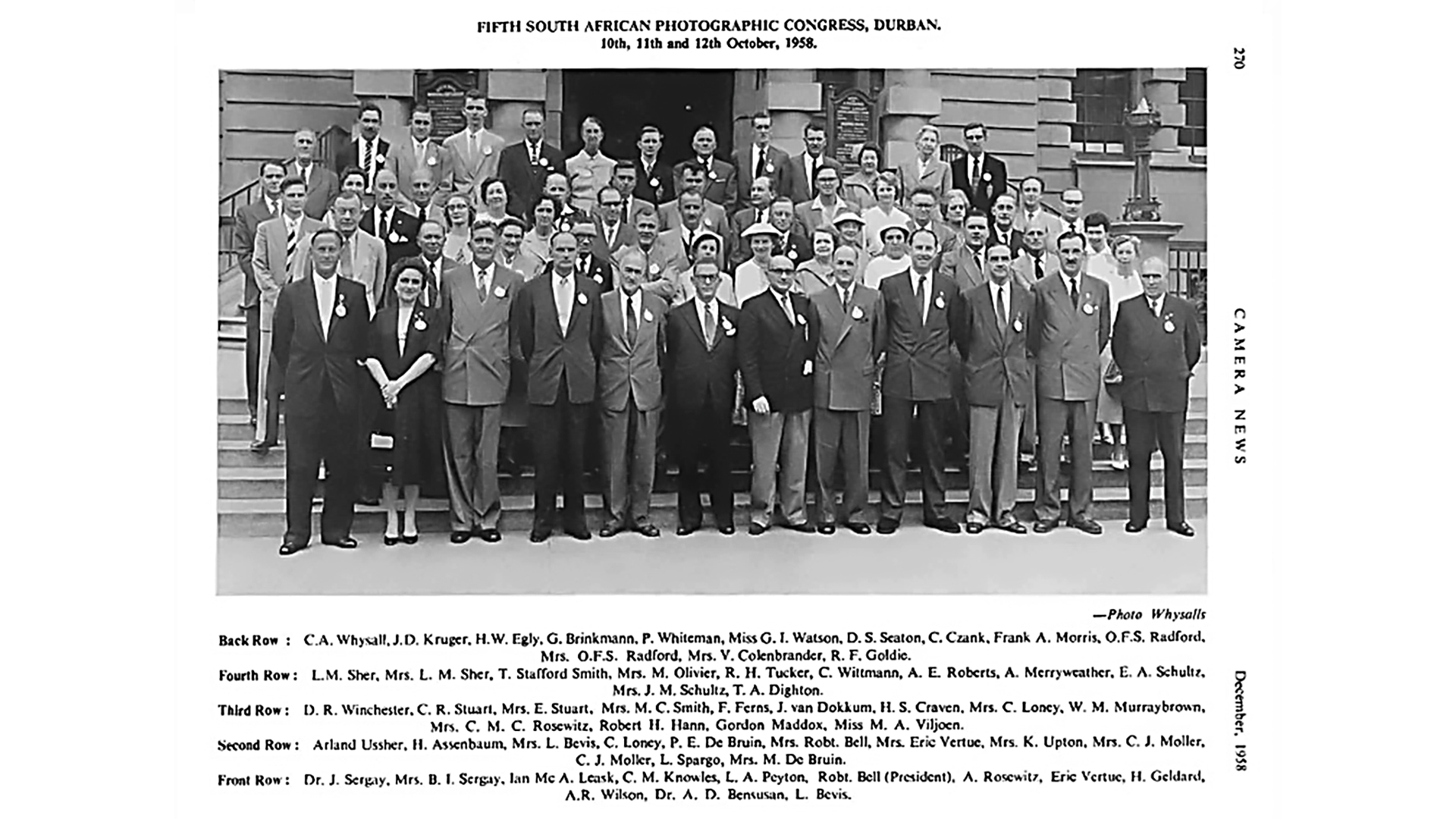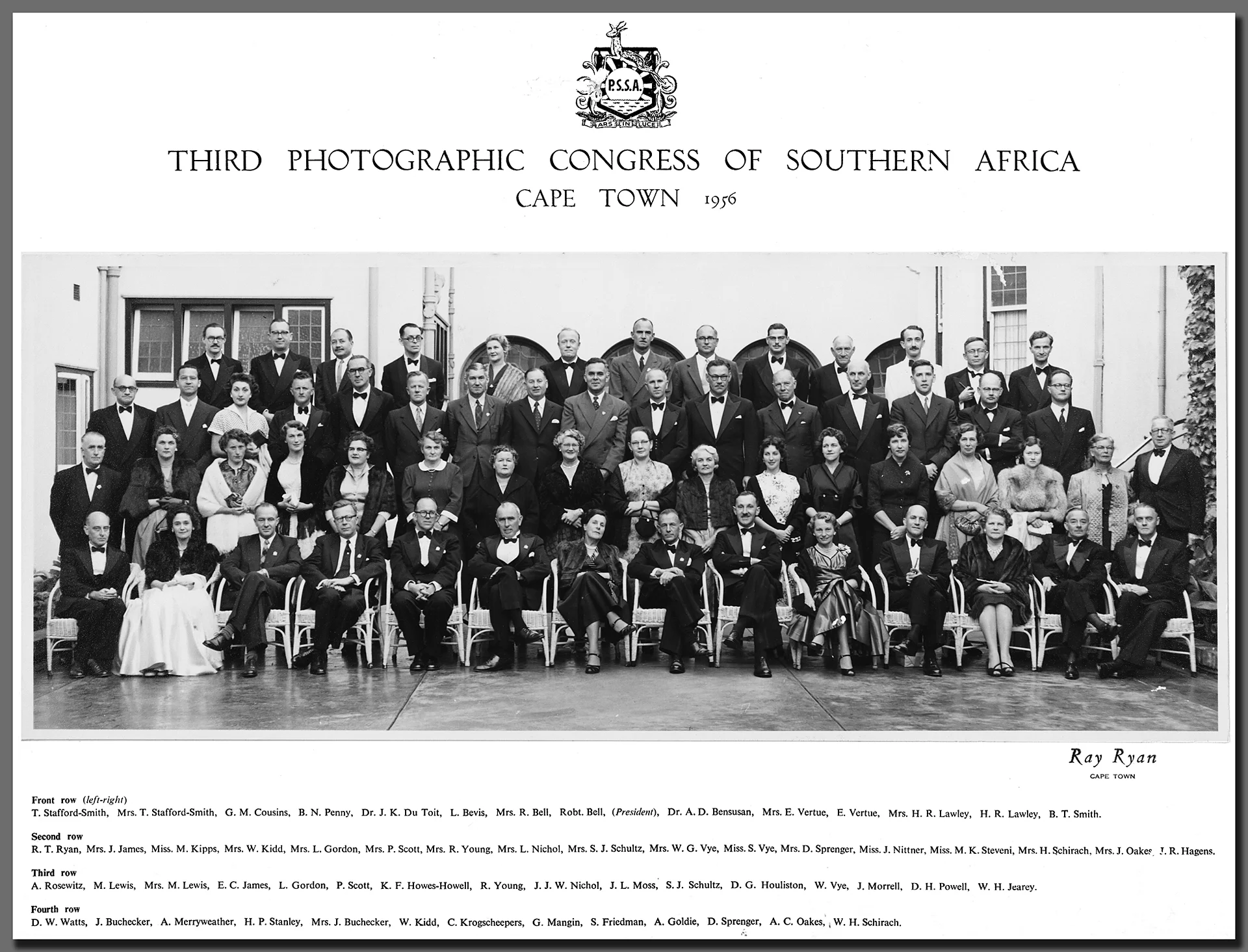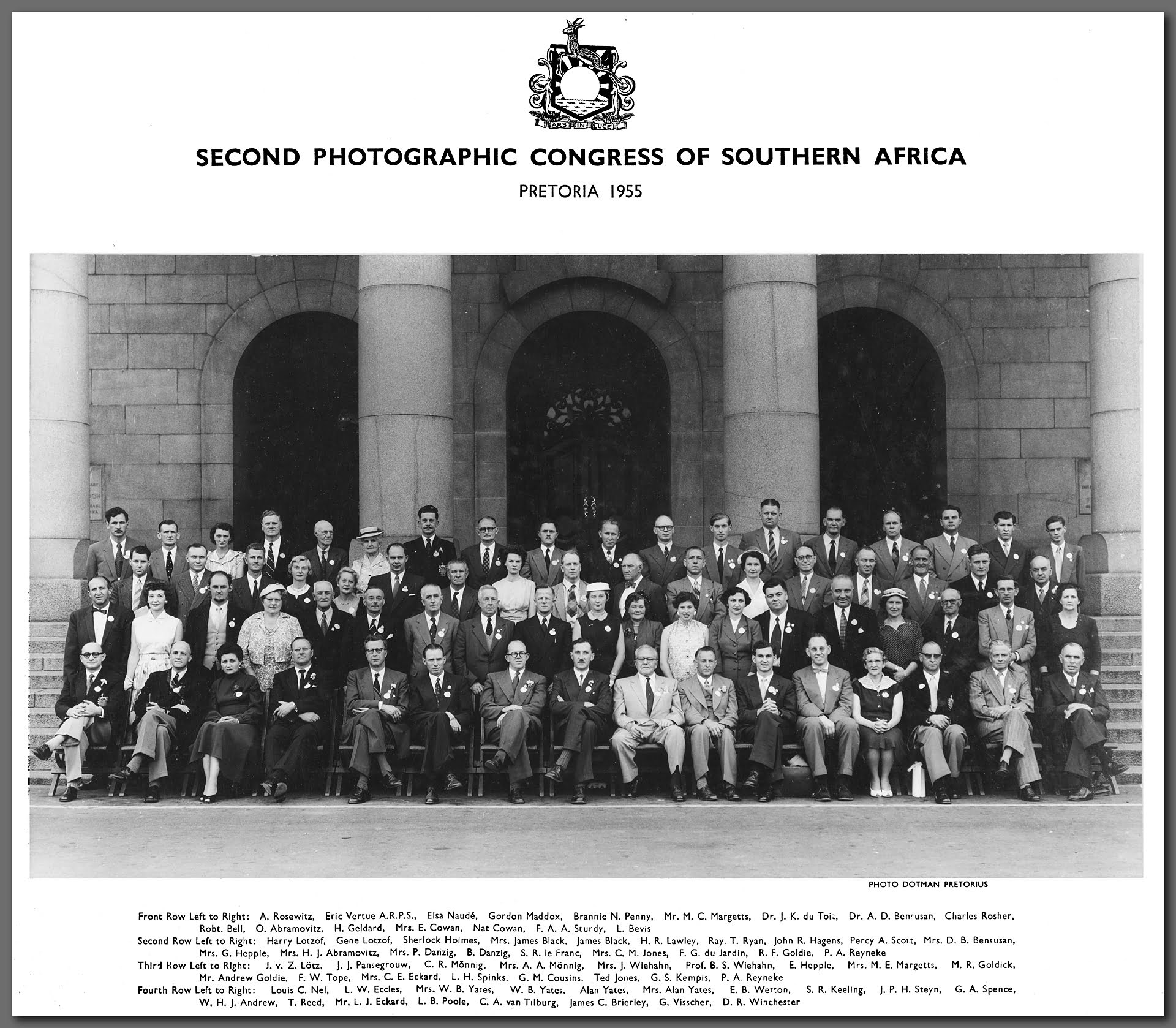 Dr Kin Bensusan of Johannesburg Photographic Society, nevertheless worked tirelessly to win support for a national organisation. During 1953 he typed and mailed over 4 000 letters to potential supporters. This resulted in prominent photographers attending a meeting at his home in Houghton, Johannesburg, to discuss the founding of a national organisation. Twenty-two of the 23 existing clubs supported Dr Bensusan’s efforts to hold a photographic congress to launch a unified body – ironically, his club, the Johannesburg Photographic Society did not support this endeavour, although they agreed that a photographic convention might serve a useful purpose.