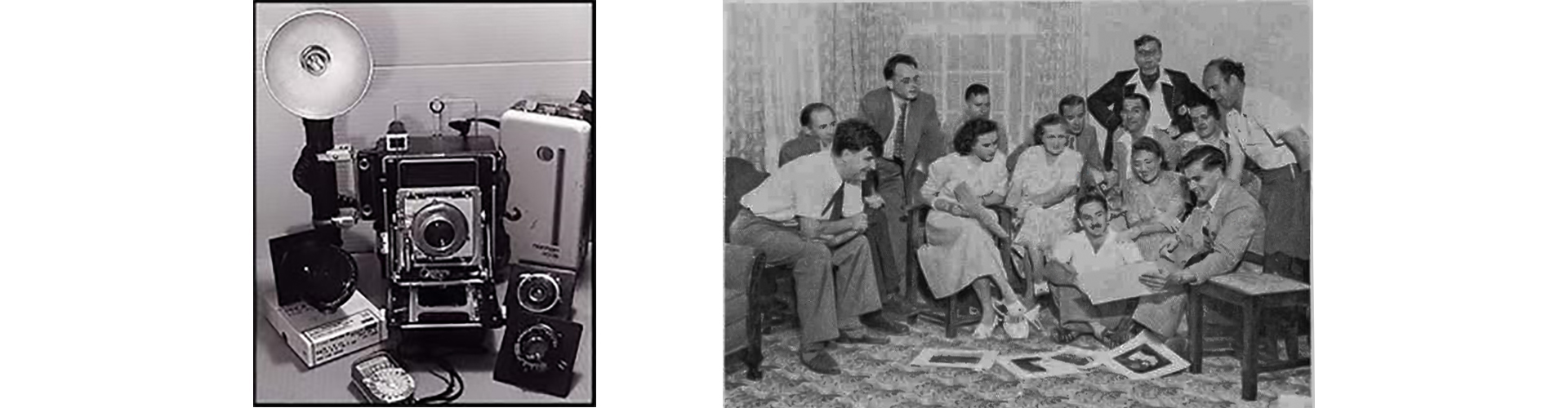 Camera equipment from the 1930’s. Photo: courtesy of Krugersdorp Camera Club. (left). Right: Worcester Photographic Society members discussing prints during a meeting at a members’ house. Photo: courtesy Camera News.