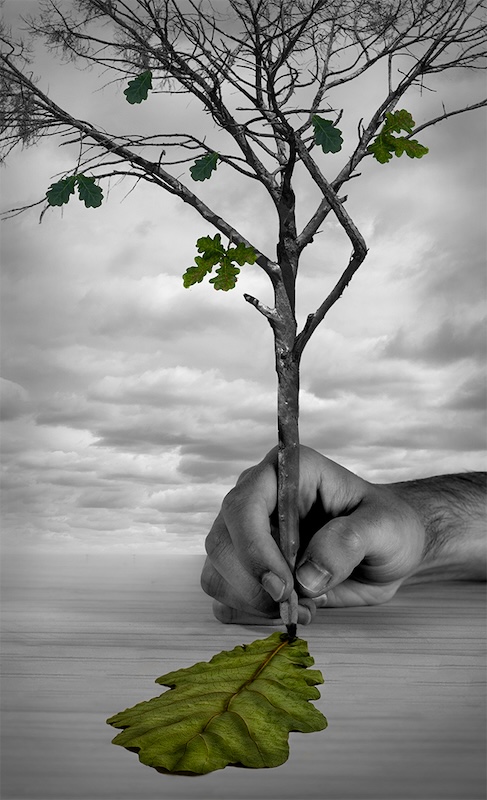 The image is a composite with texture overlays. The textures consist of my photographs of art papers and clouds applied with blend modes to the image. After this step I manipulated light and colour to get the desired effect.